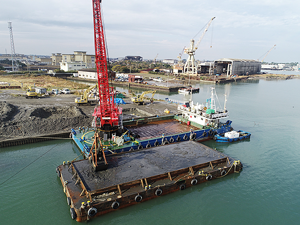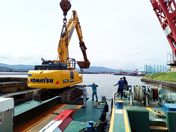 台船へのバックホウの積込