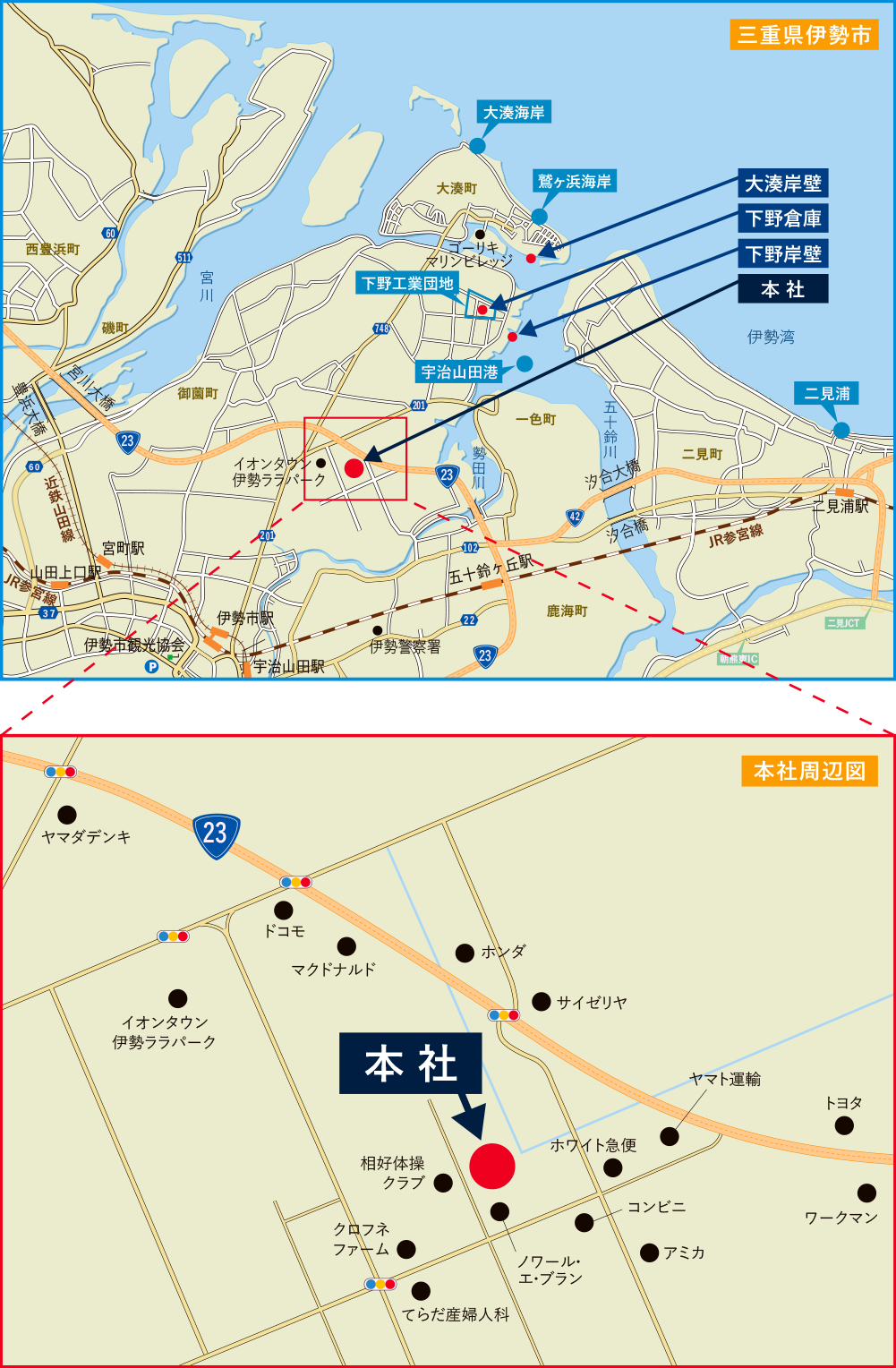 | 下野倉庫 | 三重県伊勢市下野町(下野工場団地内) TEL. 0596-36-4393 |